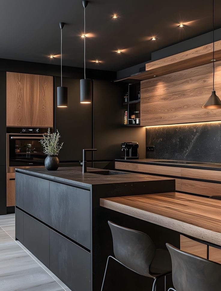 التي تميل للخطوط المستقيمة، ومقابض مخفية أو مدمجة، مع تدرجات خشبية دافئة.